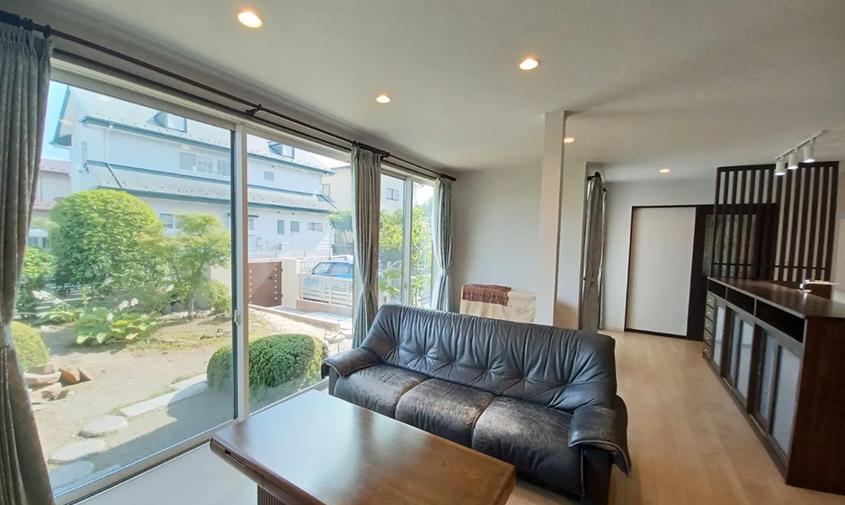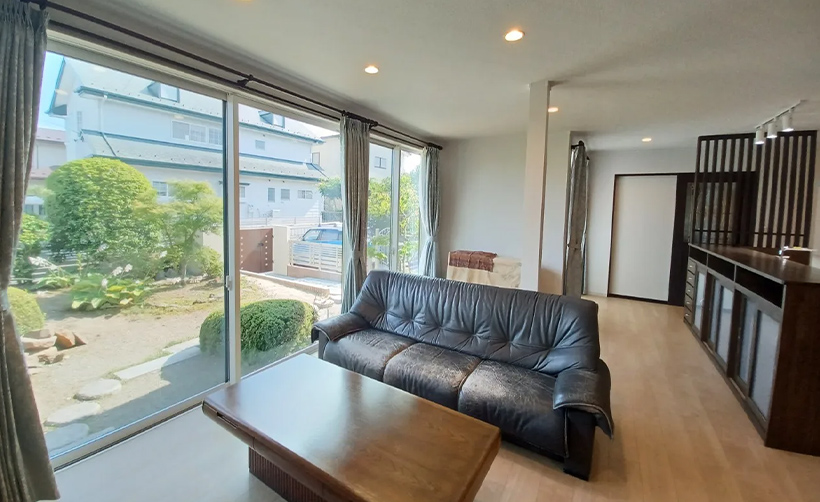 リビングは南面の窓を大きくとり、ご両親世代がお手入れされた庭を眺めながら過ごせるように、家具の位置も想定したレイアウトにいたしました。